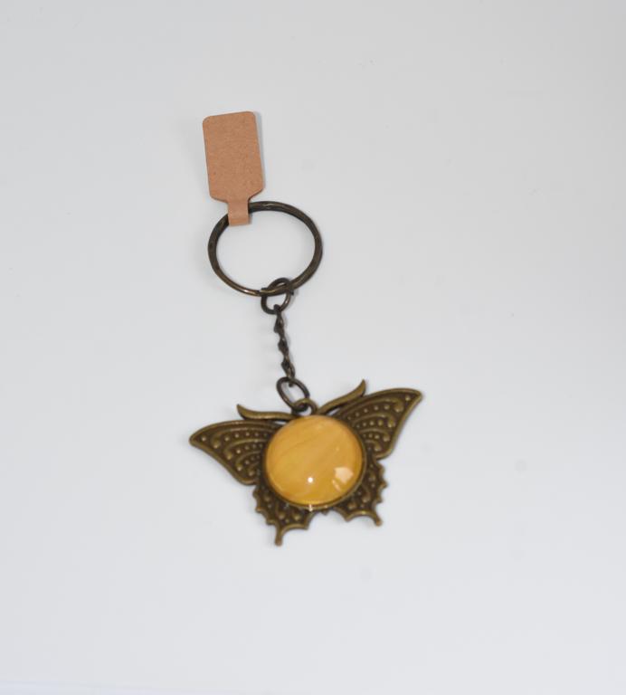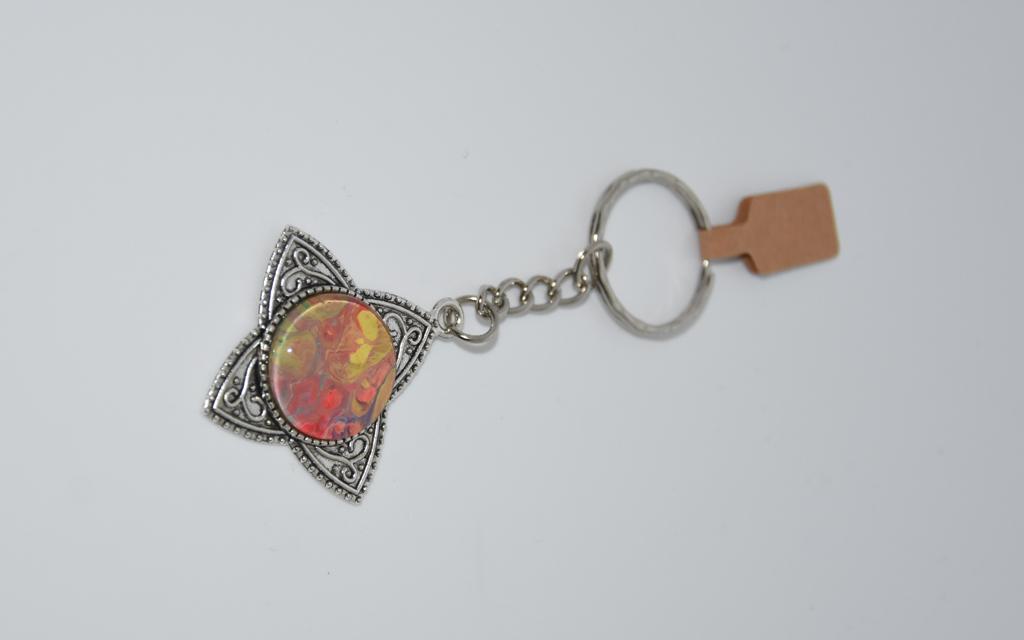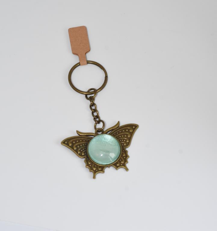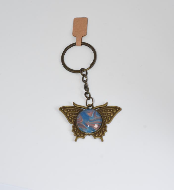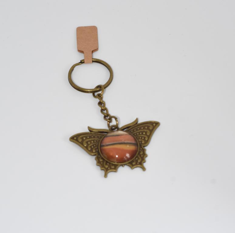 Bronze coloured base butterfly shaped keyring containing a one-off colourful burst centre.