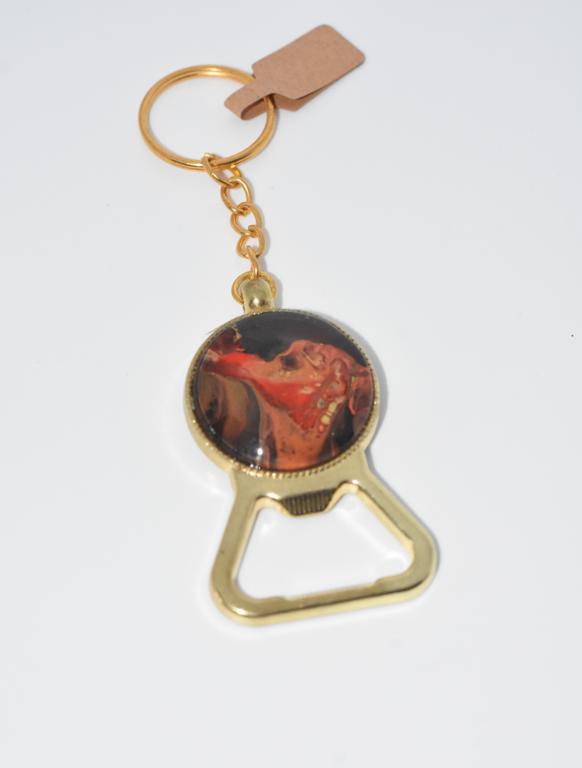 Volcano Erupts, Gold colour base, round art filled bottle opener keyring