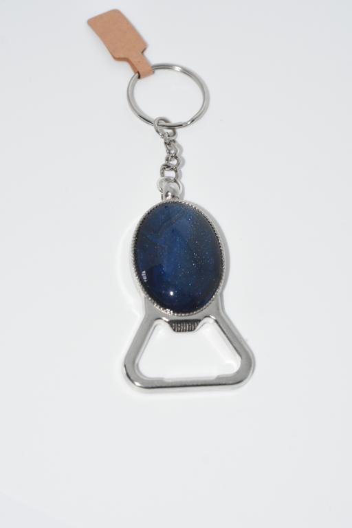 Blue night shimmer, silver colour based, oval art filled bottle opener keyring.