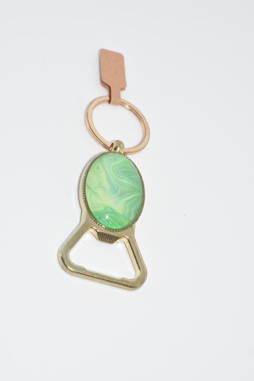 Green swirl, gold colour based, oval art filled bottle opener keyring.