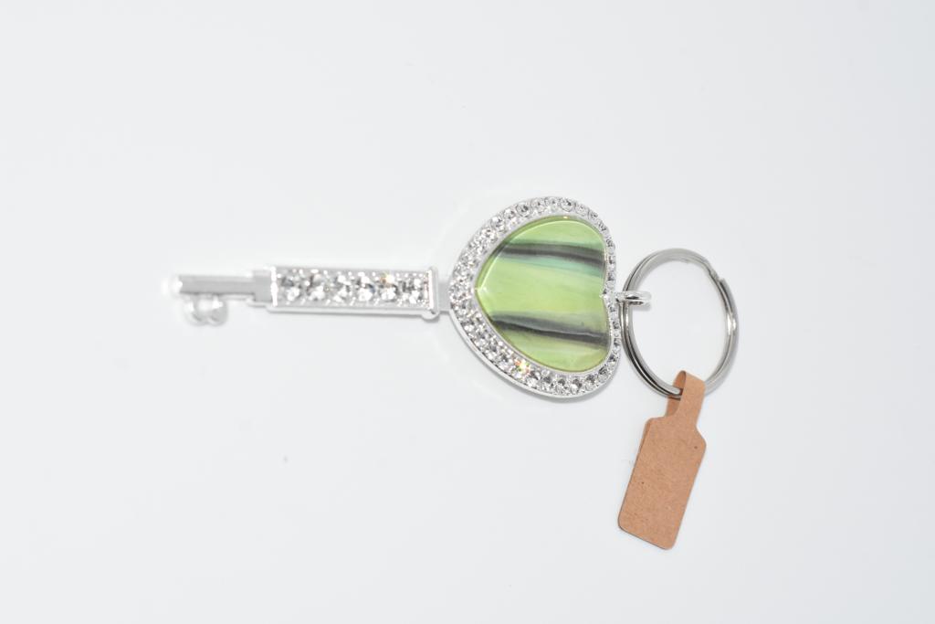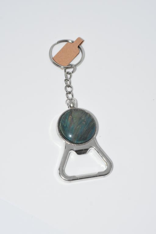 Green Blue shimmer mix, silver based, round art filled bottle opener keyring.