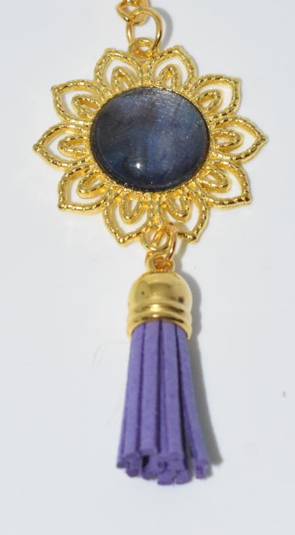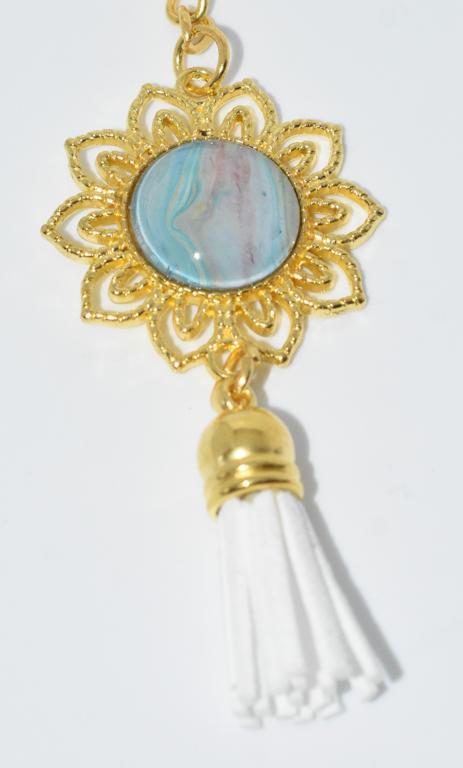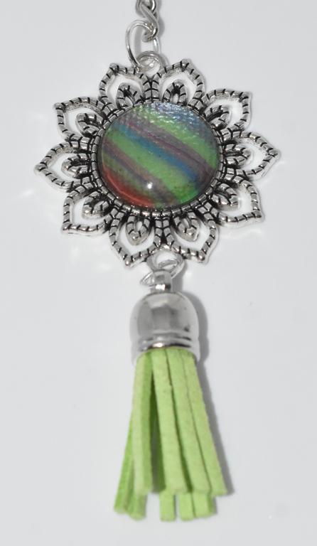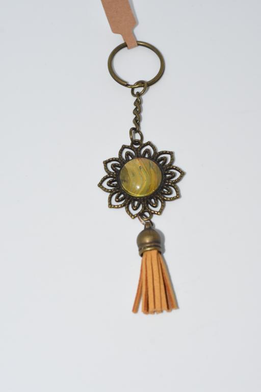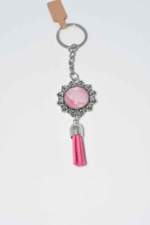 These flower shaped keyrings hold a unique colourful centre and are finished off with a contrasting tassel.